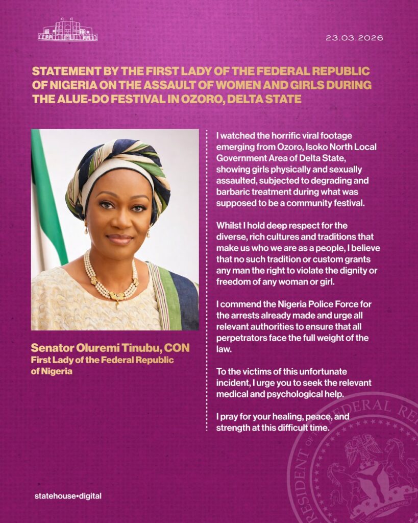 Senator Oluremi Tinubu condemned the assault of women and girls during the Alue-Do Festival in Ozoro. As reported by ALO360 the First Lady of the Federal Republic of Nigeria issued a personal statement on Sunday. Consequently she reacted to viral footage that showed young girls chased, stripped and molested in Isoko North Local Government Area of Delta State.