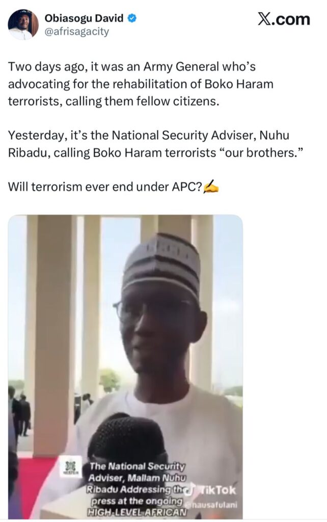 “Yesterday, it’s the National Security Adviser, Nuhu Ribadu, calling Boko Haram terrorists ‘our brothers.’ Will terrorism ever end under APC?” he posted.