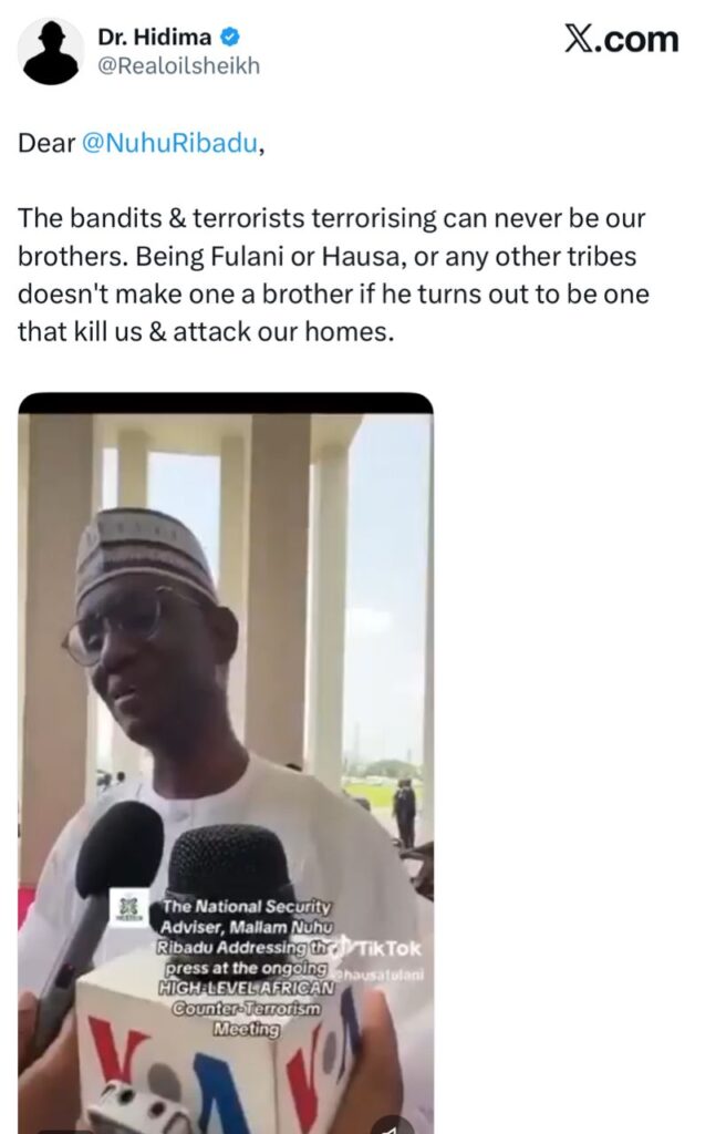 “The bandits and terrorists terrorising us can never be our brothers. Being Fulani or Hausa, or any other tribe, doesn’t make one a brother if he turns out to be one that kills us and attacks our homes,” the user wrote.